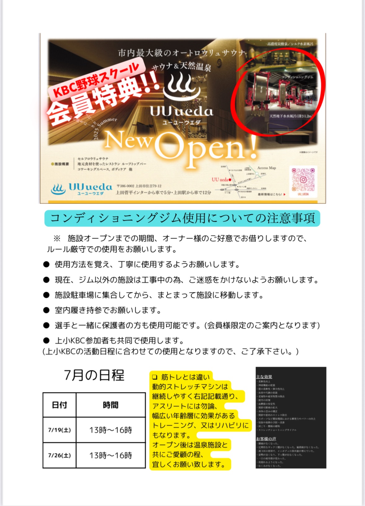 スクール正規会員様特典として、今年-𝙊𝙋𝙀𝙉-予定の温泉施設内のコンディショニングジムにて、トレーニング環境の提供です。