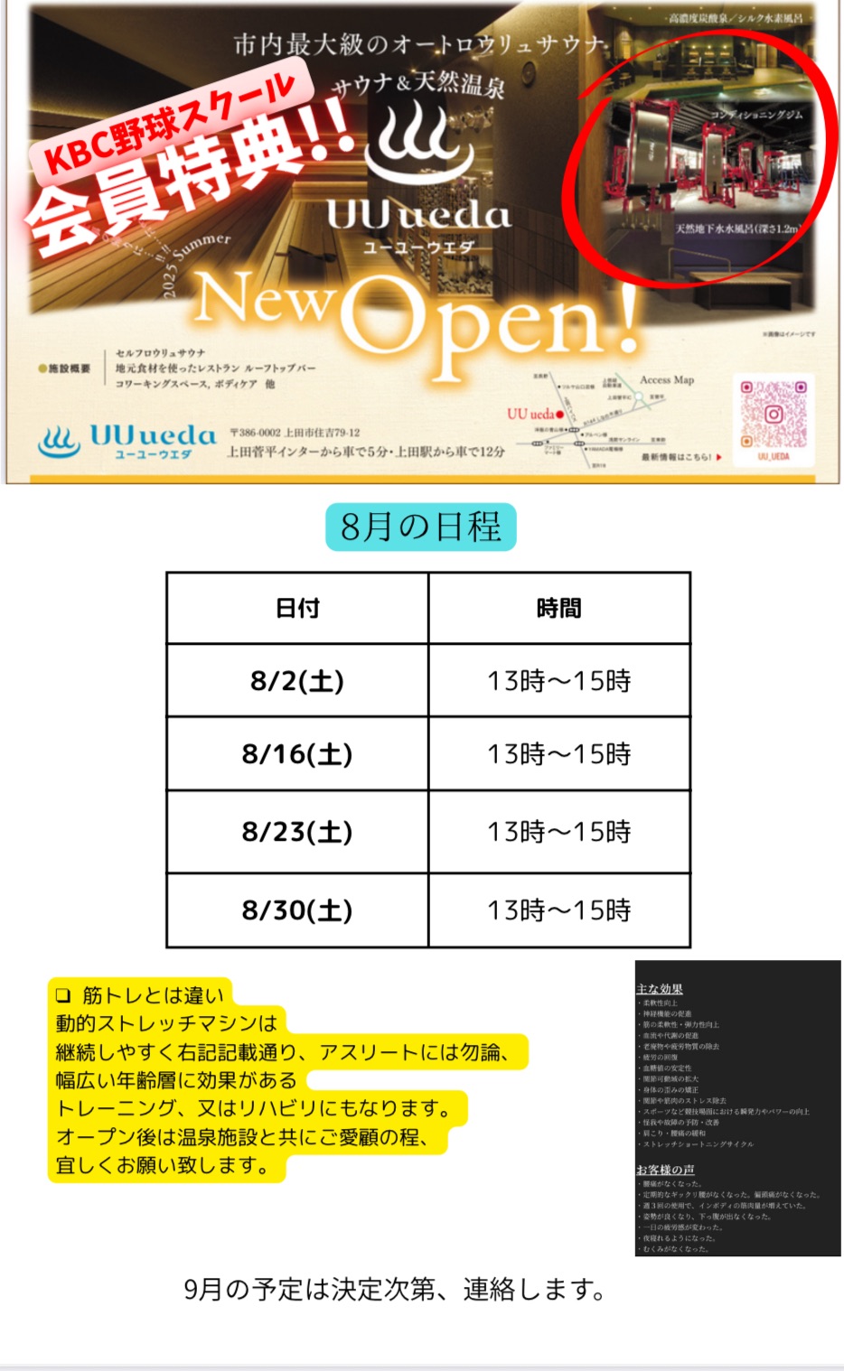 スクール正規会員様特典として、今年-𝙊𝙋𝙀𝙉-予定の温泉施設内のコンディショニングジムにて、トレーニング環境の提供です。